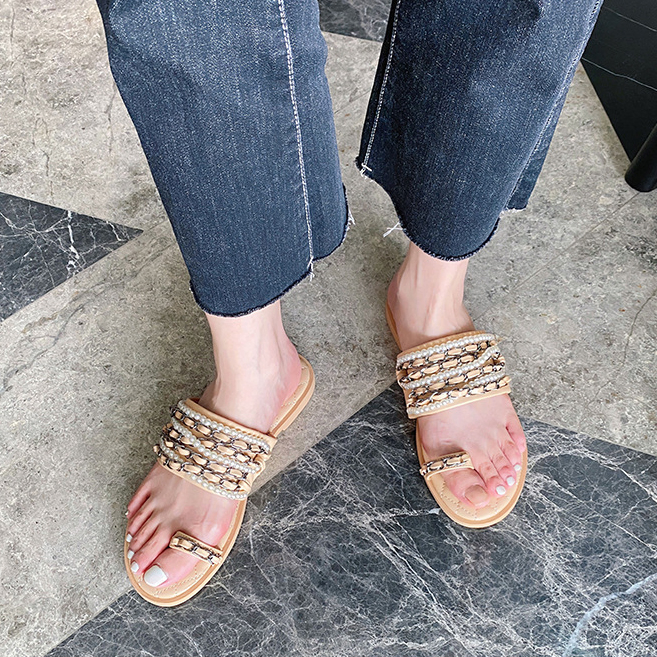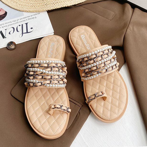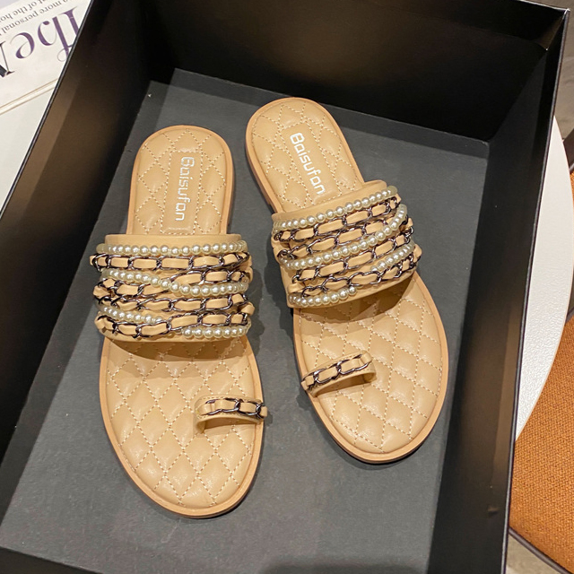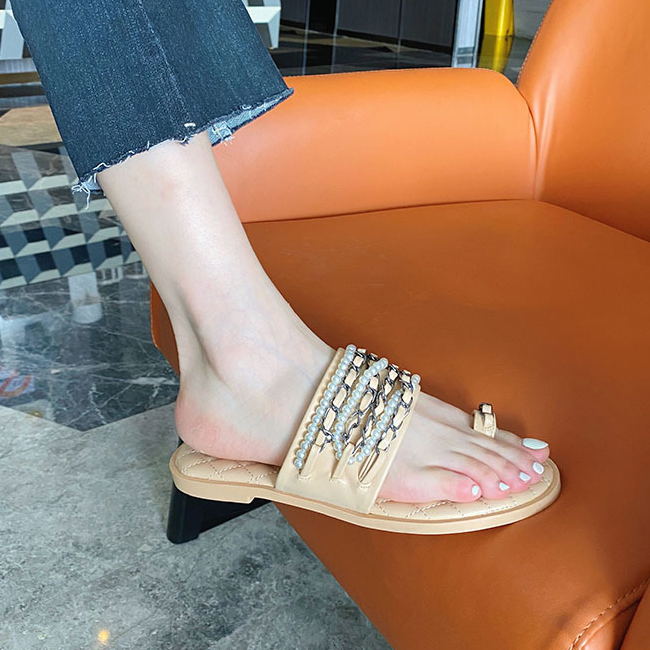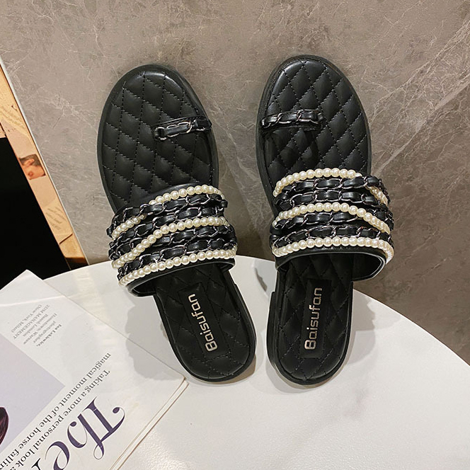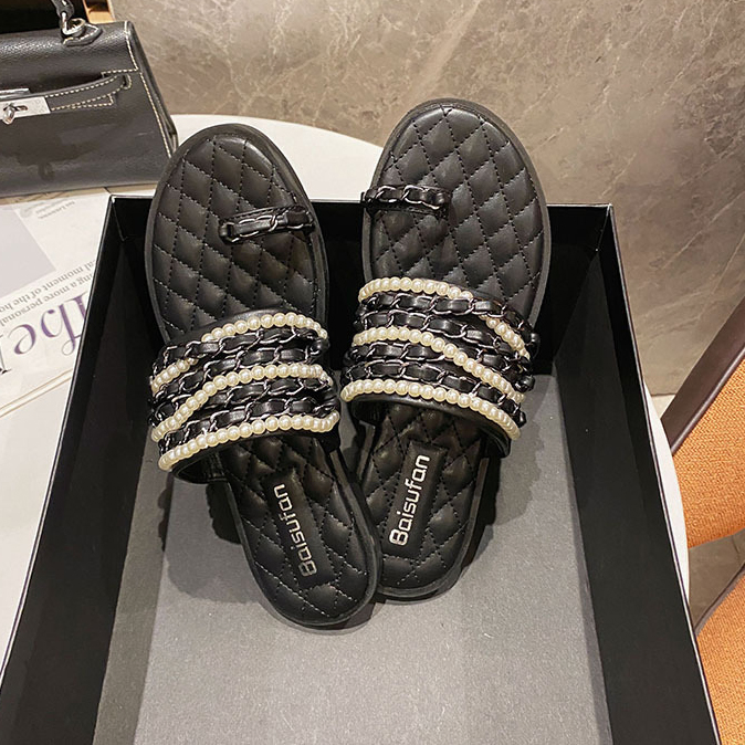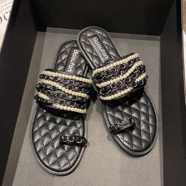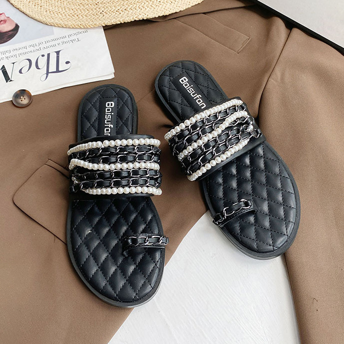 SUMMER BLACK PEARL CHAIN SLIP-ON FLAT SANDALS GB-0667